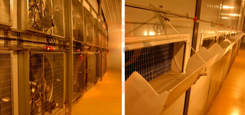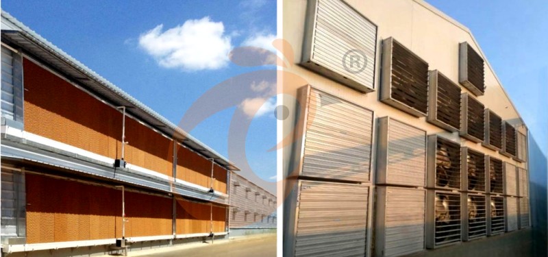 La température intérieure peut être maintenue entre 13 et 26 °C grâce à l'association de ventilateurs et de rideaux humides. Les ventilateurs situés à une extrémité du poulailler aspirent l'air chaud. Sous pression, la vapeur d'eau rafraîchissante provenant des rideaux humides situés à l'autre extrémité pénètre dans le poulailler.
