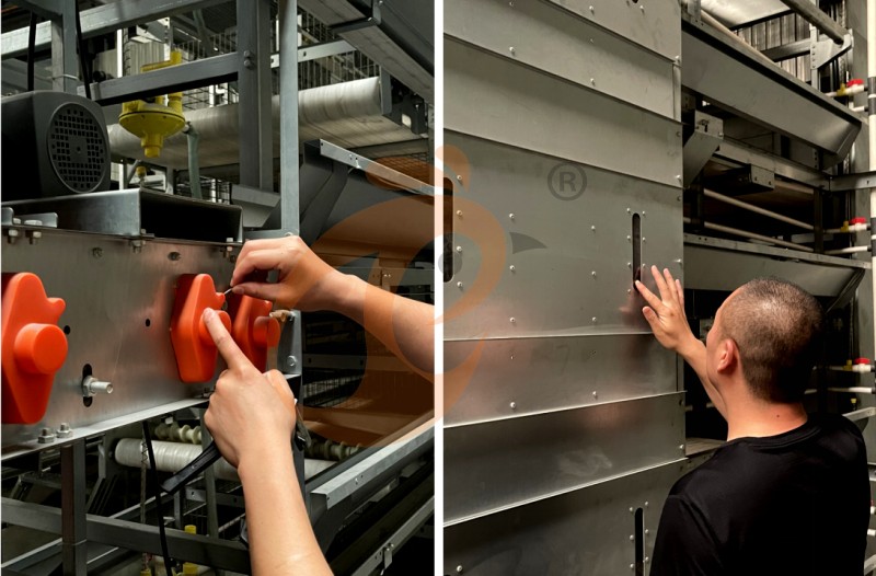 Transfert des poulettes dans les cages : les éleveurs les placent aux premier et deuxième niveaux de la cage, les plaçant sur le grillage en plastique fixé au fond de la cage. Après deux à trois semaines, les poulettes sont retirées du grillage et réparties dans toute la cage.